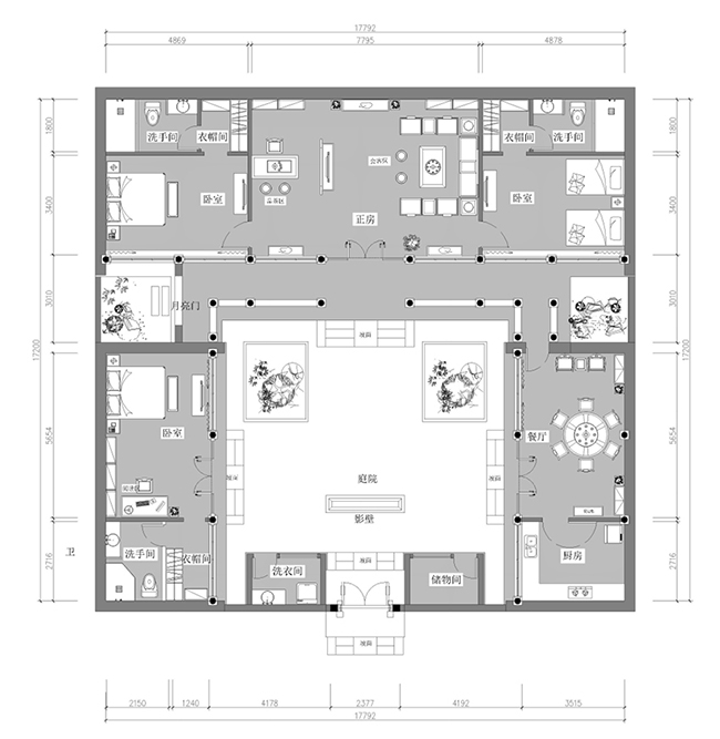 本次四合院设计,嵌入山水,融入自然。围绕“简练、安逸、自然”主题展开,具有古典、精致的独特气质。整体设计既有繁复的细节,又有留白的婉约,创造出简繁有度而不失文化底蕴的家居氛围。