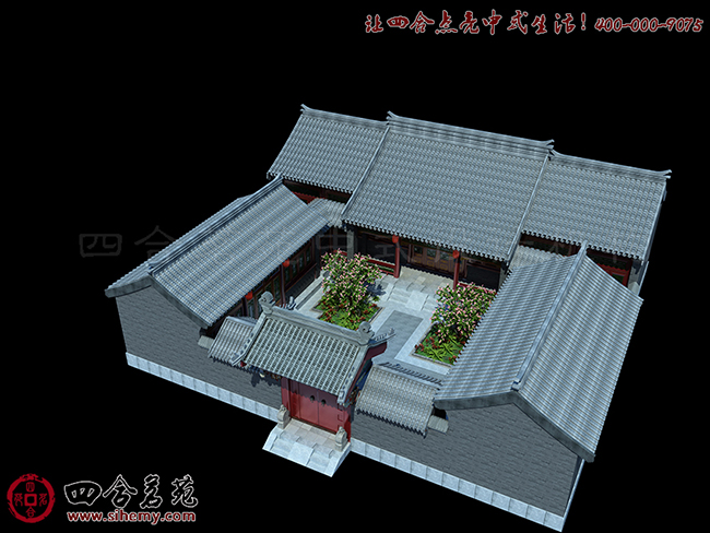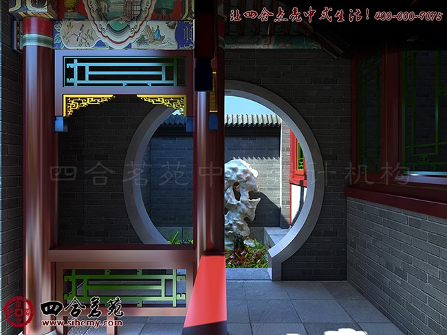 四合院设计,大,有轩昂之意;小,含清幽之美。透过游廊后的月亮门,可见方寸之间亦是郁郁葱葱、秀丽多姿。