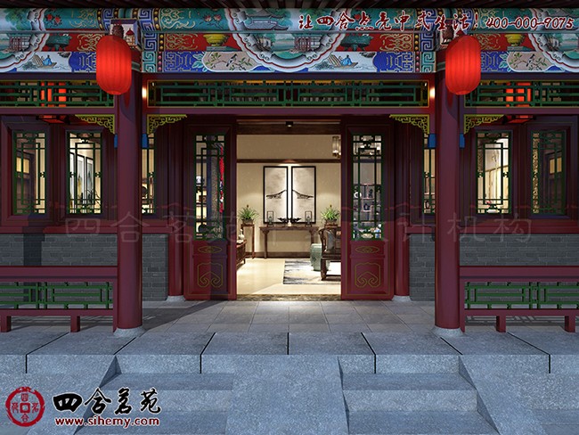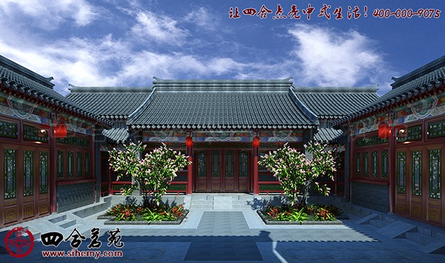 一进四合院,迎面就看见绿树红花,在房前对称栽着,那点点绿叶,在阳光下发清发亮。屋檐瓦当下,大红灯笼后,是那花团锦簇、灵活生动的苏式彩画。搭配雕梁绣户、丹楹刻桷,表现出一种专属东方的仪态万方与绚烂多姿。