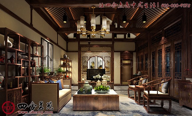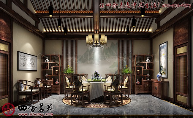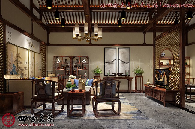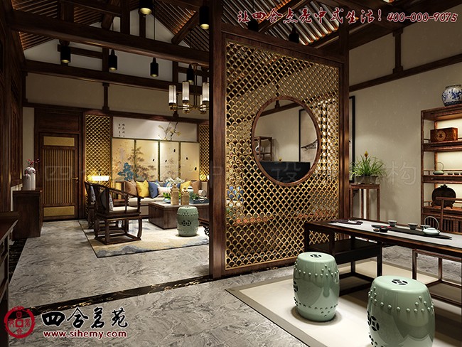 设计在空间布局上强调中式古典与现代的融合,根据室内外不同生活场景,增加空间的时光流动感。在仿古中增加现代的生活气息,通过对比产生碰撞,再用设计师圆融的修饰笔触将“矛盾”调和,以此手法研磨出巧妙的时代谐和感,让空间氛围显得别具一格且富有文化气息。