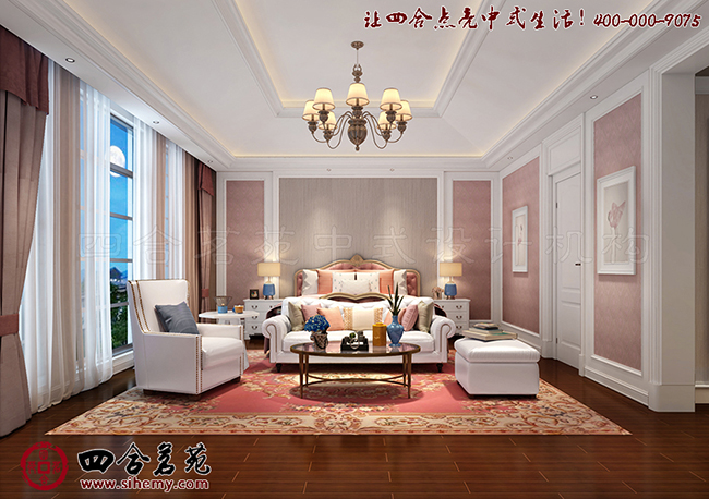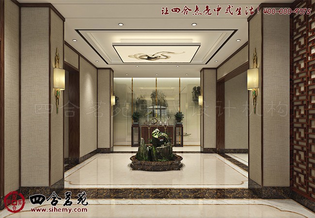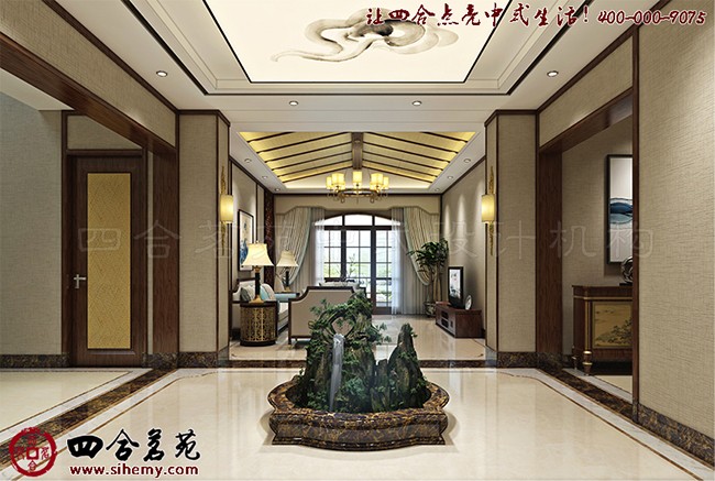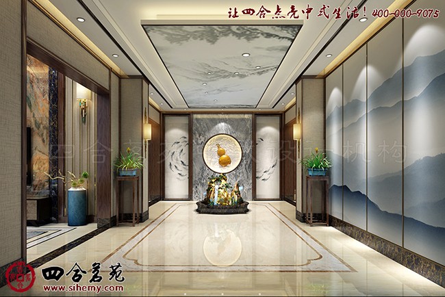 本案新中式别墅设计室内空间多采用对称式的布局,格调高雅,造型淳朴,将中式经典元素加以提炼,并与现代风格及材质兼容并蓄,既体现出人们对东方精神的追求,又为居住空间注入新时代的气息。