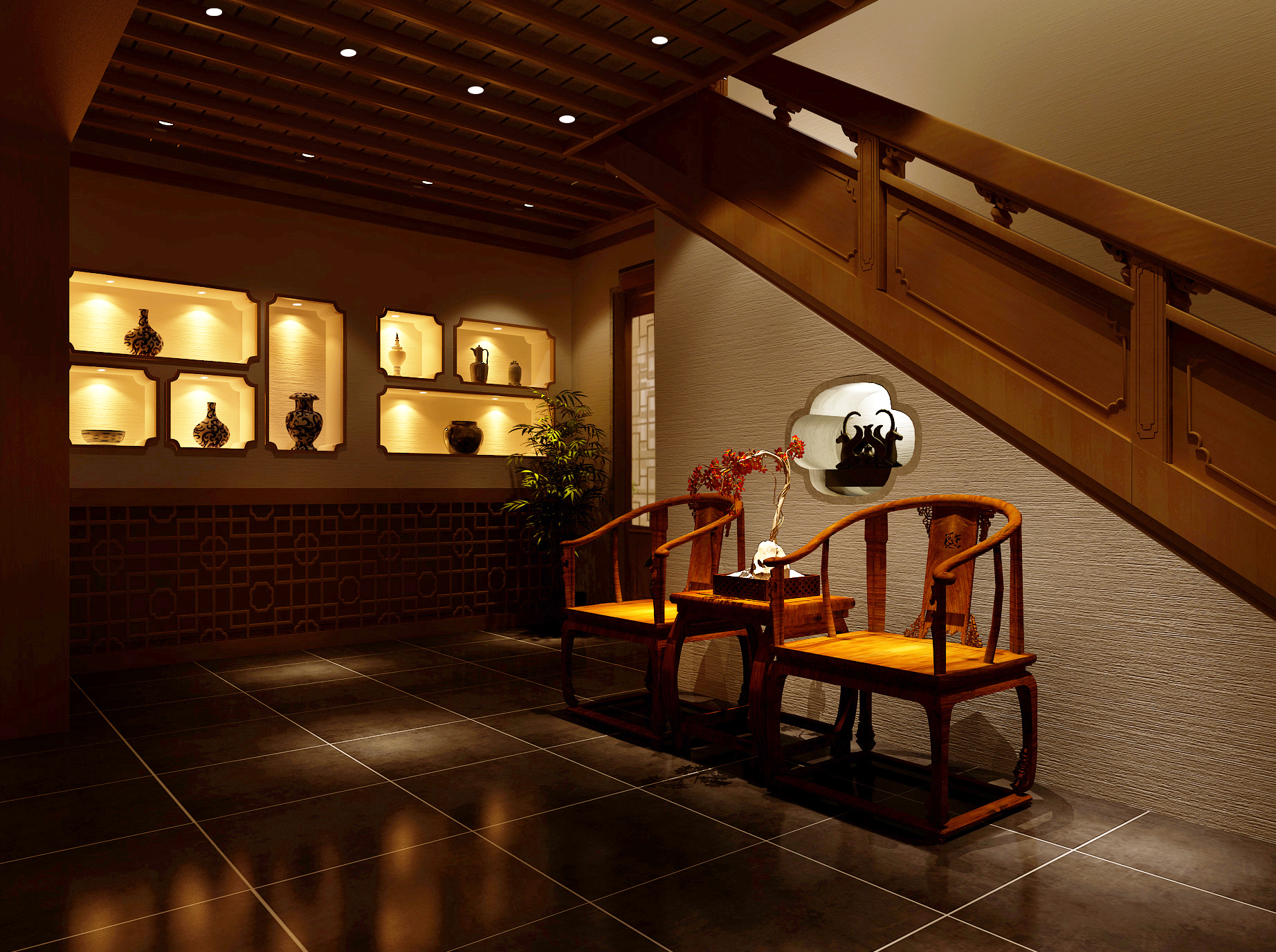 详情介绍:本案中式别墅设计采用现代与传统结合的手法,将实用、古典的中式风格融合在一起,对中式风格进行了别样的演绎。用整体统一的色彩搭配,佐以优雅造型的东方家居,虚实相生,刚柔并济,营造出一种私密又惬意的空间氛围。